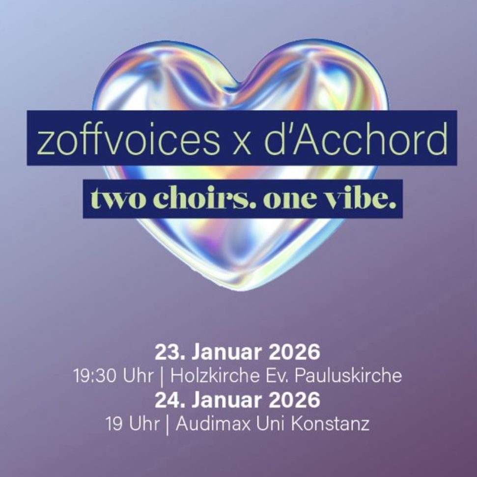 Bei ihrem gemeinsamen Konzert entfalten d’Acchord und zoffvoices eine energiegeladene musikalische Begegnung. Das Publikum darf sich auf einen Abend freuen, der musikalische Stärke, emotionale Tiefe und dieinspirierende Wirkung gemeinschaftlichen Singens eindrucksvoll erlebbar macht.